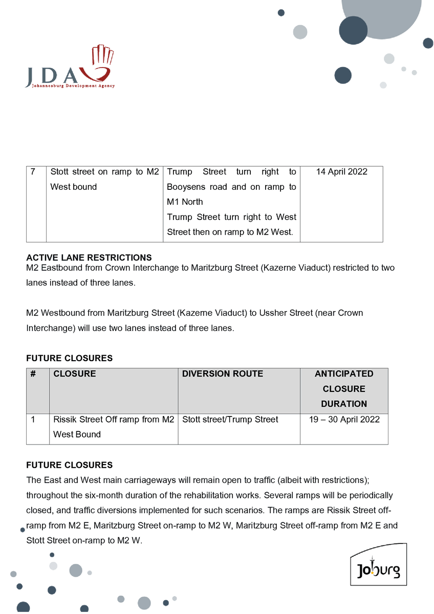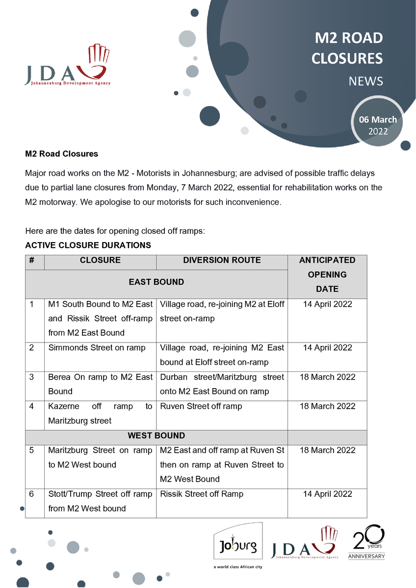 @JDA_joburg on the M2 road closures#jhbtraffic#M2closure#M2rehabilitationhttps://twitter.com/jda_joburg/status/1500423646124429318 …