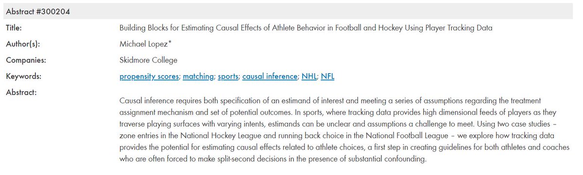 #JSM2019 yesterday alongside@causalkathy@alexdamour@skdeshpande91 on causal inference applications in sports. Here’s a rough summary of my talk on how player tracking data is needed to fill a missing gap in sports analyses (short thread)pic.twitter.com/M5368erIdw