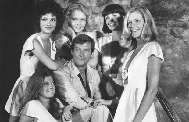 Roger Moore, as bond, and the Drax ladies on-set in 'Moonraker'