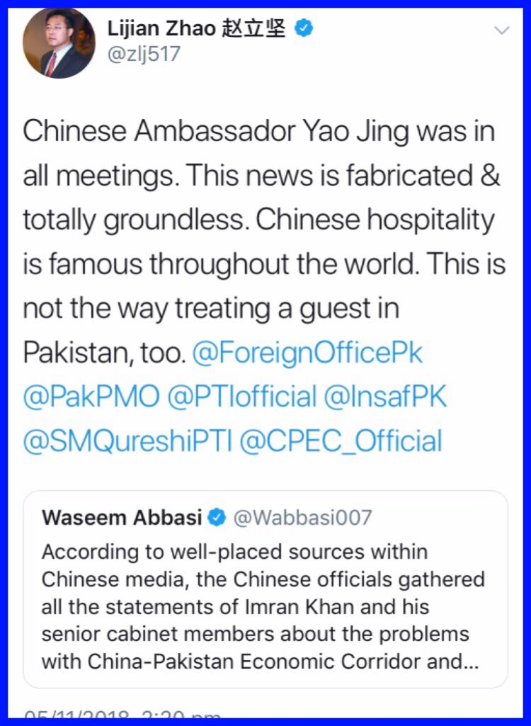 جیو کا ملازم ایک بار پھر جھوٹ پھیلاتے ہوۓ رنگے ہاتھوں پکڑا گیا۔ چینی دورے کے حوالے سے (ایک اور نئی جھوٹ پھیلانے کی مشن نیادور ٹیوی کوٹ کرتے ہوۓ) جیو کے ملازم نے جیسے ہی جھوٹ ٹویٹ کیا ، چینی سفیر نے فوری دبوچ لیا اور کھڑے کھڑے بے عزت کر دیا