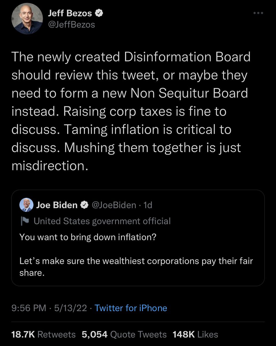 #JeffBezos can spot nonsense without a Disinformation Board? https://twitter.com/jeffbezos/status/1525309091970699265 … -