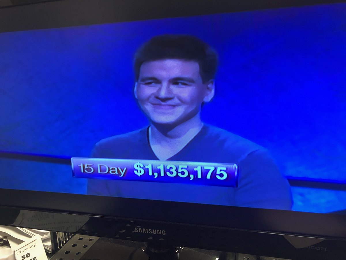 @Jeopardy are not sleeping well watching#JeopardyJames win about $76,000 per show, which is more than#AlexTrebek makes per show!pic.twitter.com/OGwKEAEjET