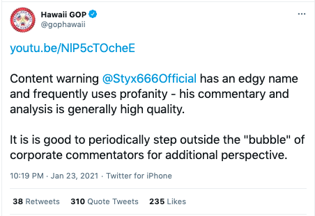 @gophawaii has a good explanation for this. I expect them to do the right thing and address this appropriately by ensuring it won’t happen again. Unless...they want us to assume neo-Nazis are behind the acct. 2021 is already topping 2020 in boundary pushing.#JewHate https://twitter.com/StopAntisemites/status/1353751156850388993 …