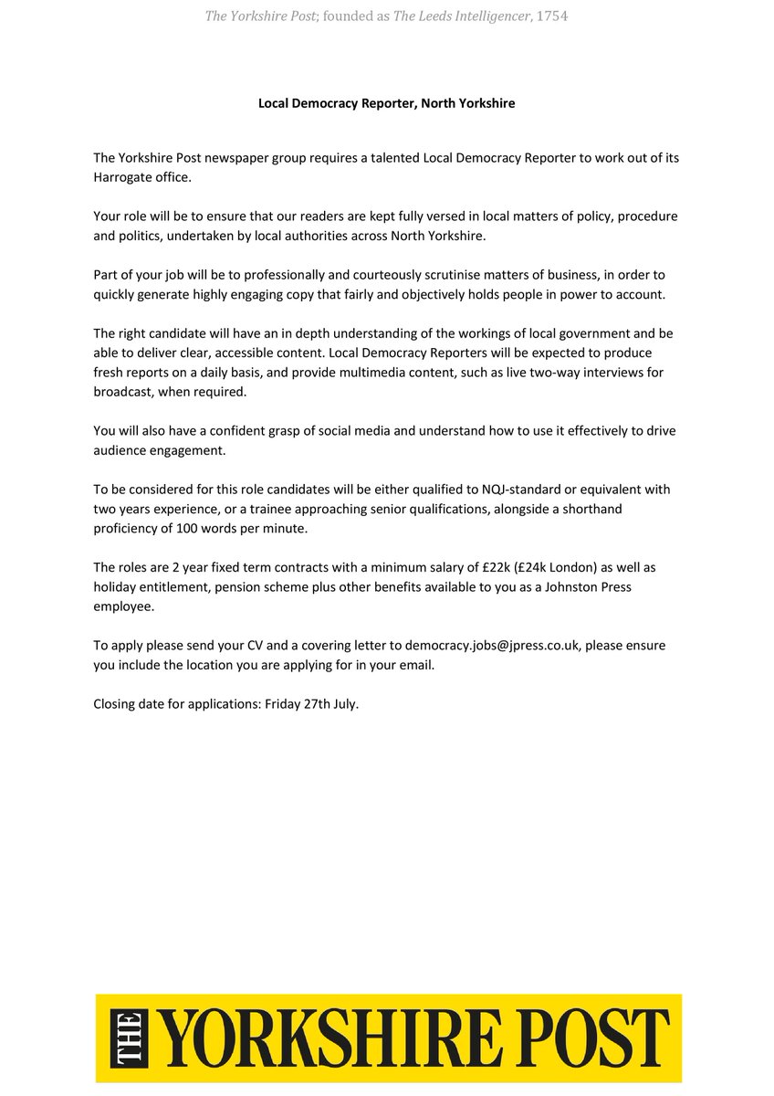 Job Opportunity: Wanted - a tenacious, talented, inquisitive Local Democracy Reporter for North Yorkshire.
