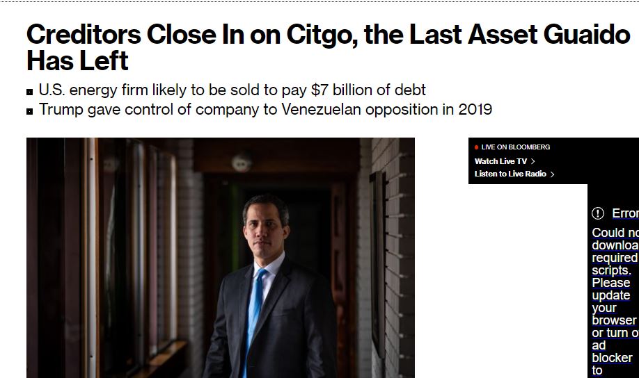 #Trump regime declared the unelected puppet#JuanGuaido 'president' of#Venezuela, it was not just an empty farce.#Venezuelan assets in the USA, esp. the oil company#Citgo, were transferred to Guaido, then US companies move in to steal them. https://www.bloomberg.com/news/articles/2021-08-05/creditors-close-in-on-citgo-the-last-asset-guaido-has-left …pic.twitter.com/8q2kkHpB01