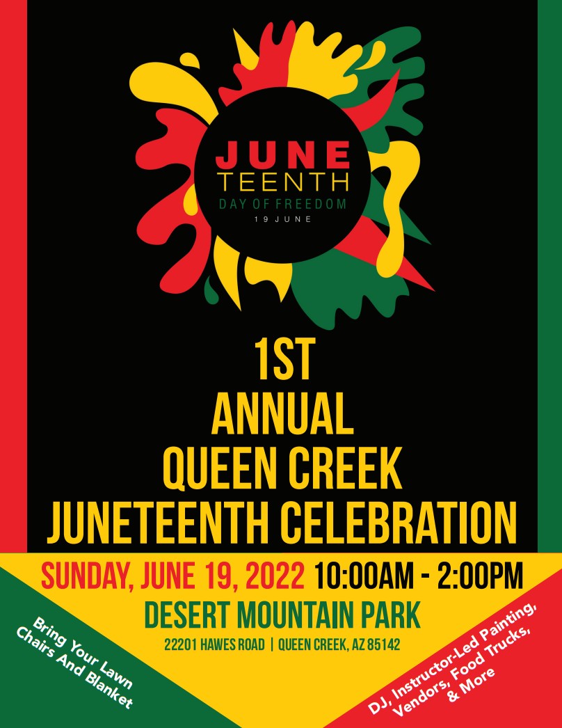 #Juneteenth Celebration in Queen Creek at Desert Mountain Park on June 19! Music, Instructor-Led Painting, Silent Auction, Vendors, Food Trucks and More: http://ow.ly/kKbH30sjMoj pic.twitter.com/11MRMVRoXh