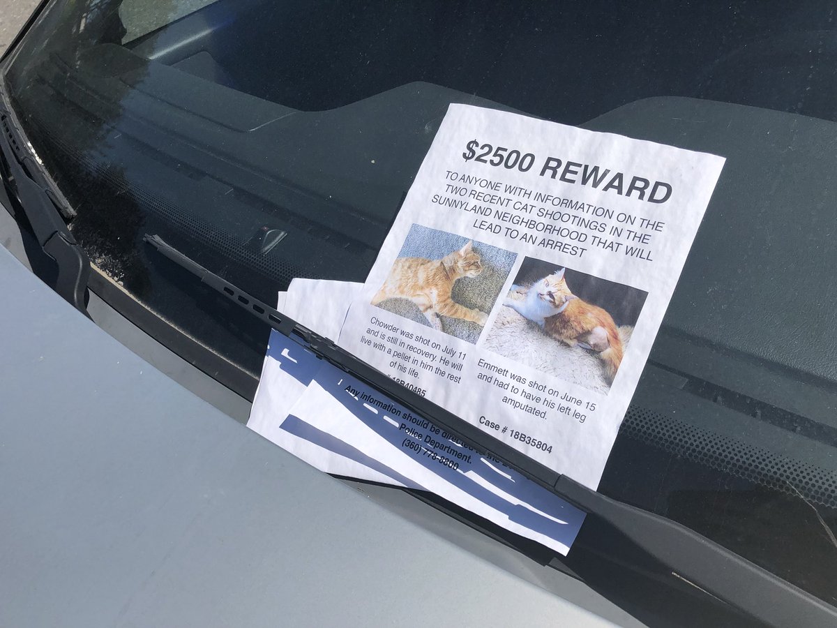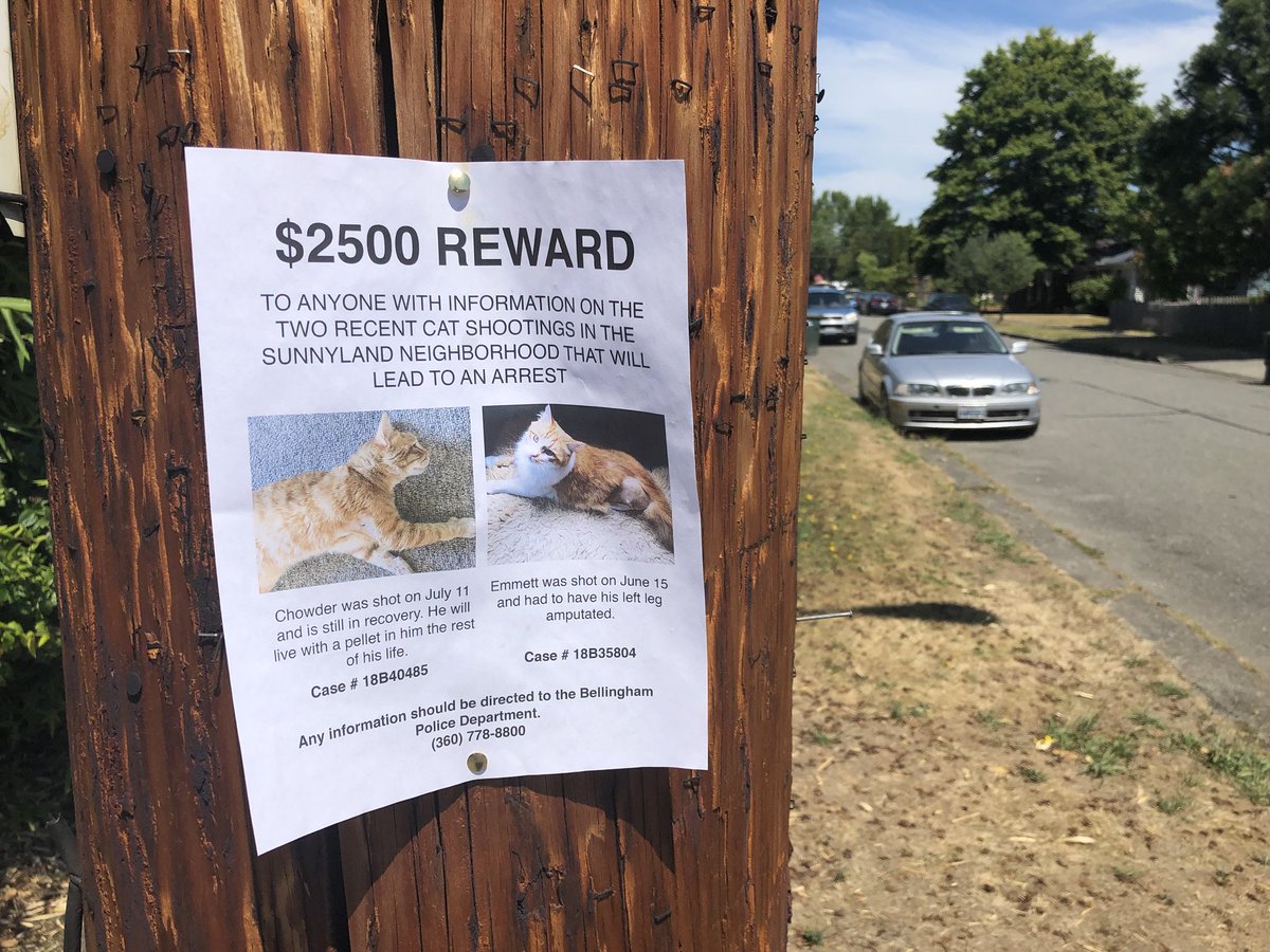 These flyers have been posted around the Sunnyland neighborhood in Bellingham after 2 cats have been shot since June 15th. Both survived. A $2,500 reward is now being offered for information that leads to an arrest.