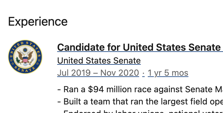 @AmyMcGrathKY's LinkedIn, she lists the United States Senate of the employer for her Senate bid. Lol#KYSen pic.twitter.com/Ug0lQL7eQJ