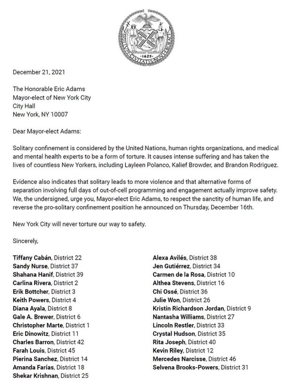 #LayleenPolanco,#KaliefBrowder,#BrandonRodriguez and so many others, let me make it clear — solitary confinement is torture. Proud to be in good company with 29 of my colleagues. We will not waver.#HALTsolitary https://twitter.com/NYCAIC/status/1473271989238444035 …pic.twitter.com/rWoN9ihpeo