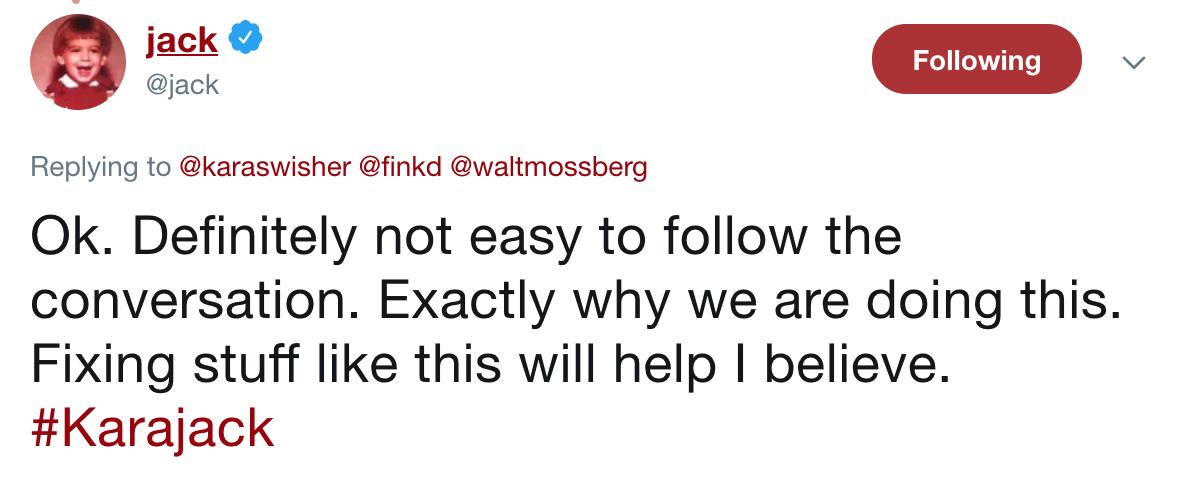 #KaraJack thread is a perfect example of both the potential and current flaws with conversation on Twitter. This is exactly why "making Twitter more conversational" is one of our top initiatives. https://twitter.com/karaswisher/status/1095443704448397312 …Show this thread -