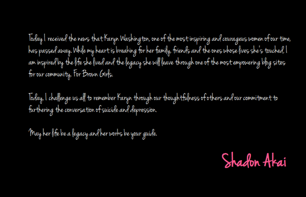 #KarynWashington. Creator of#ForBrownGirls website, reportedly commits suicide at age 22 http://on.thegrio.com/1oUDGGQ pic.twitter.com/IVDH3OSvJB