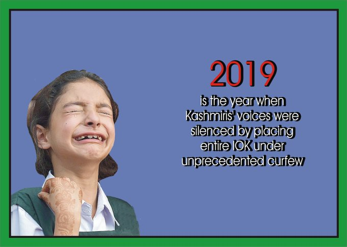 #OccupiedKashmir, 2019 was the year when#Kashmiris’ voices were silenced by placing entire Indian Occupied Kashmir under unprecedented curfew#KashmirBleeds#KashmirWantsFreedom#KashmirHistory#KashmirSolidarityDay#KashmirDay#modikilling8mkashmiris#میراکشمیر_جل_رہاہےpic.twitter.com/4NQpSjsSEx