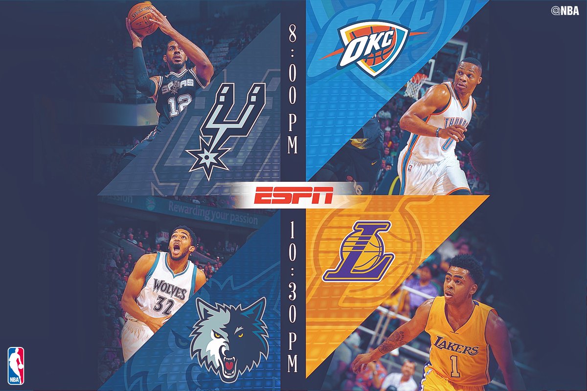 #KiaTipOff15 is going down@ESPNNBA! At 8pm/et, the@OKCThunder host the@Spurs followed by@Timberwolves/@Lakers!pic.twitter.com/8BrHFIStTV