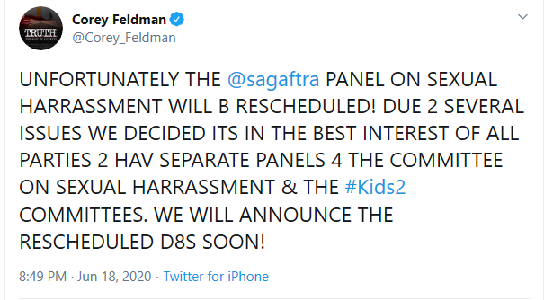 Breaking News regarding Corey Feldman who was supposed to be on a live panel for