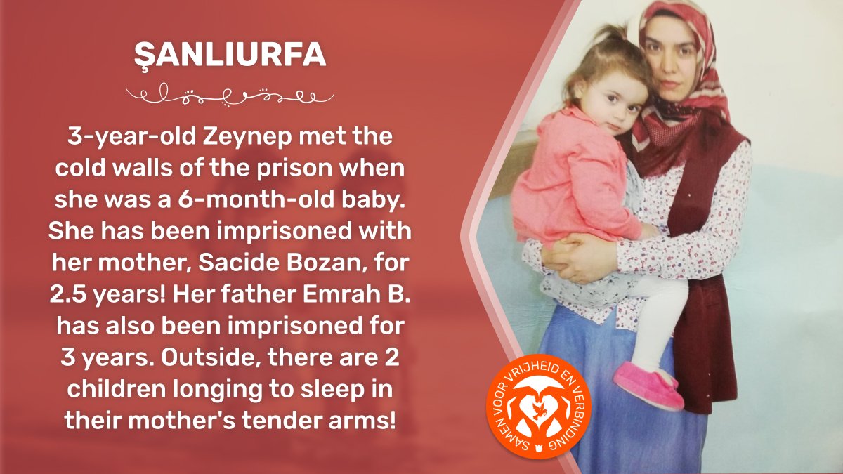 3 y-o Zeynep entered the jail when she's a 6-m-o baby. She's been jailed with her mom, Sacide Bozan, for 2.5 years! Her dad Emrah has also been jailed for 3 years. Release all moms n dads.