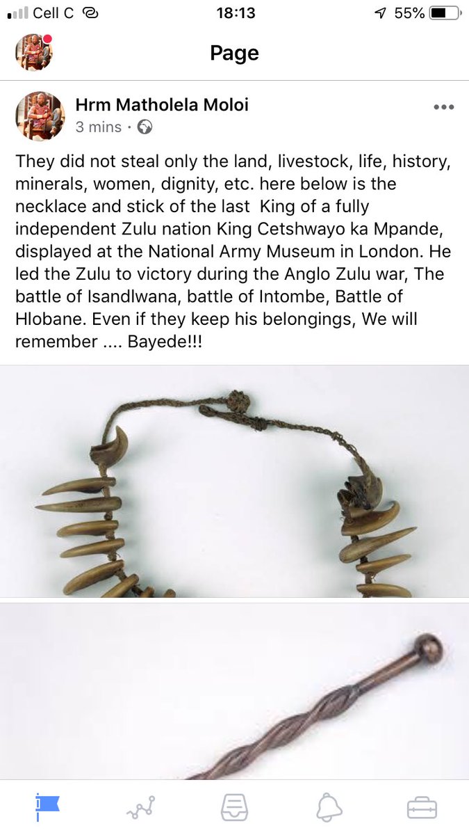 They did not steal only the land, livestock,life, history, minerals, women, dignity, etc. here below is the necklace and stick of the last King of a fully independent Zulu nation King Cetshwayo ka Mpande, displayed at the National Army Museum in London.