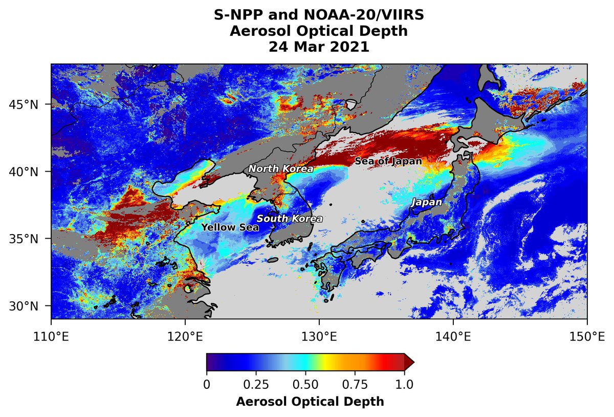 #VIIRS aerosol optical depth (AOD) composite from#SNPP &#NOAA20 captured aerosol plumes (#smoke &#dust) across east#China,#YellowSea,#KoreanPeninsula,#SeaofJapan,#Japan today, 24 Mar. Gaps in AOD from clouds.@m_parrington@Pierre_Markuse@JPSSProgram@pawanpguptapic.twitter.com/OiulGPLVFN