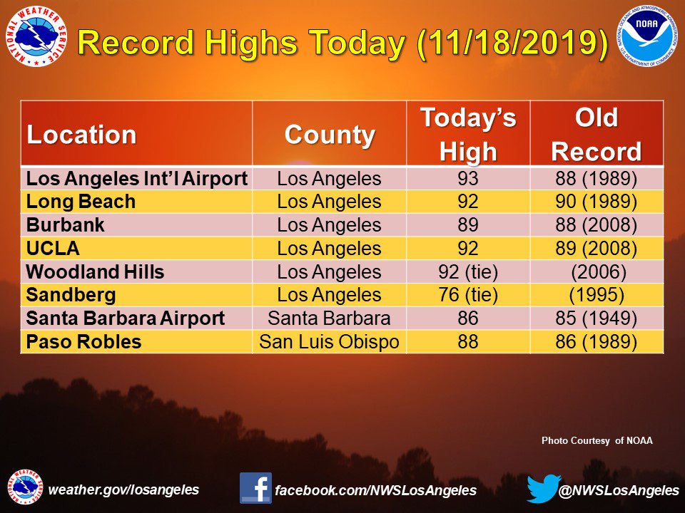 #SoCal today, here is a list of preliminary records for daily highs!#CAwx#LAheat pic.twitter.com/Y5x8DpIQaI