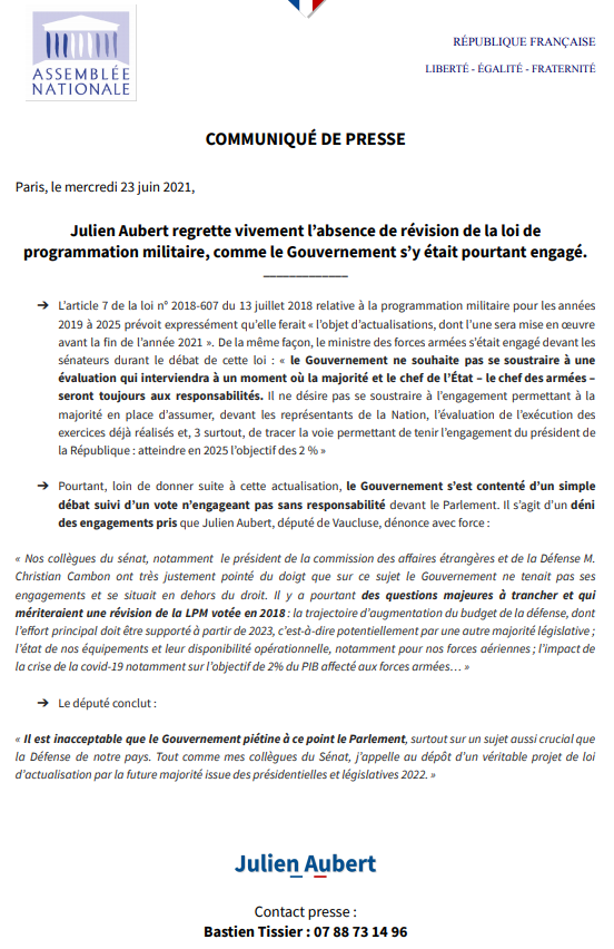 Le gouv. s'était engagé en 2018 a une révision de la loi de prog. militaire mais cette semaine il propose au Parlement un simple débat suivi d’un vote n'engageant pas sa responsabilité ! J’appelle au dépôt d’un véritable projet d’actualisation ! #LPM pic.twitter.com/6aioHgi0vB