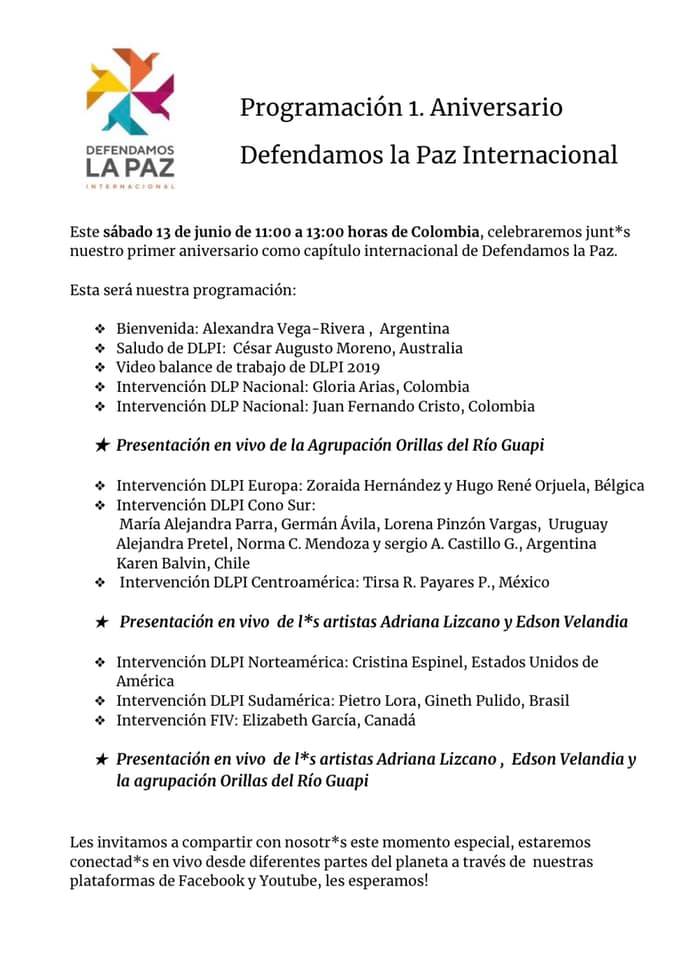 #13Junio nos unimos con júbilo a la celebración del#1Aniversario de#DefendamosLaPazInternacional@dlpinternal, habrá transmisión en vivo a través de las redes sociales de DLPI, los esperamos!#LaPazEsPosible#SumateALaPazpic.twitter.com/udho9oaplO