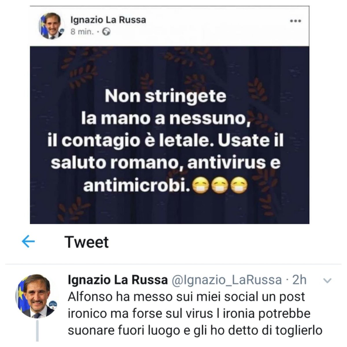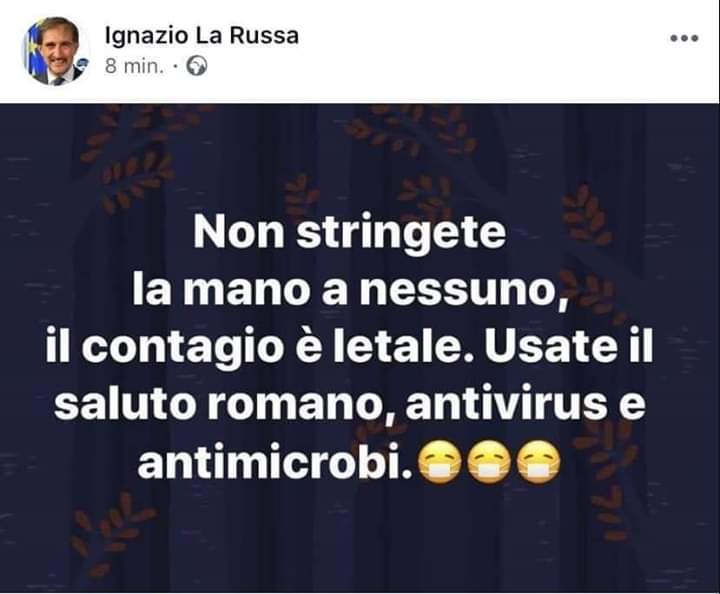 #LaRussa of Fratell d'Italia tweeted: "Don't shake anyone's hand, contagion is lethal. Use the#Fascist salute, anti-virus and anti-microbes." The tweet was removed after a few minutes.#Italy https://www.repubblica.it/politica/2020/02/03/news/coronavirus_tweet_larussa-247486148/ … via@repubblica -