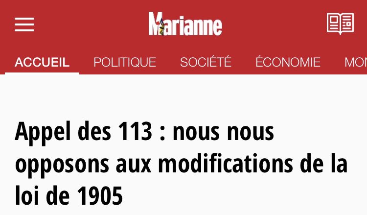 @NPolony , Marcel Gauchet, Jacques Juilliard, Georges Bensoussan, Pascal Bruckner l'appel des 113: nous nous opposons à la modification de la loi de 1905#laïcité@mariannelemaghttps://twitter.com/mariannelemag/status/1080177284315860993 … -