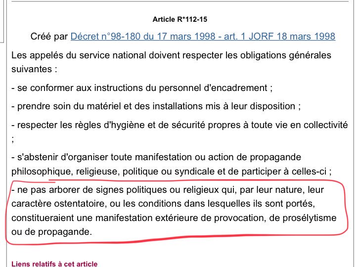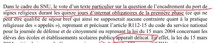 #laïcité préconise le non encadrement du port de signes religieux lors des futur « service national universel » des 14-16 ans alors qu’actuellement la loi prévoit une restriction de port de signes religieux à l’occasion de la journée de défense et de citoyenneté. pic.twitter.com/w1hP8sGGhh