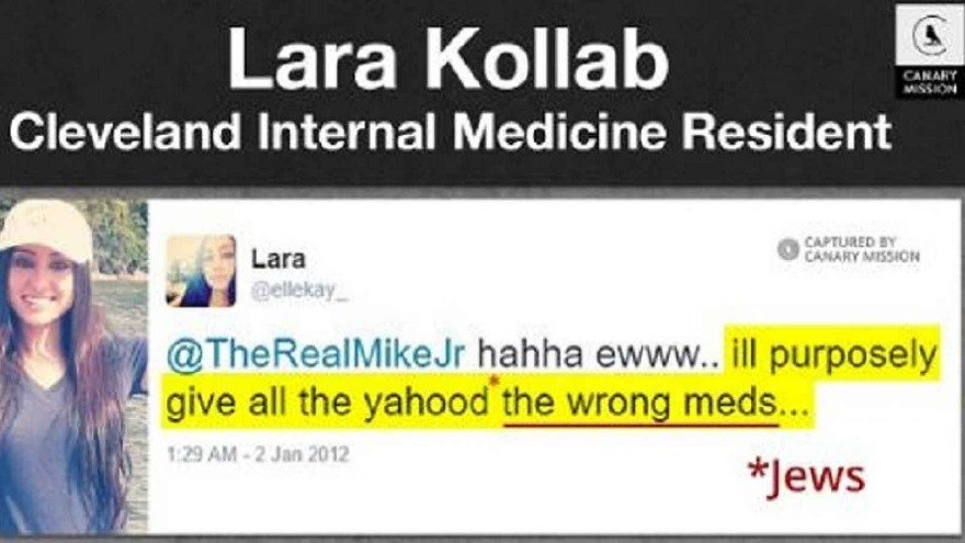 #LaraKollab, who once tweeted she'd give Jews the wrong meds, has been fired from@KernMedical https://www.israellycool.com/2019/04/02/antisemite-lara-kollab-fired-from-residency-program-at-kern-medical/ …@canarymission -