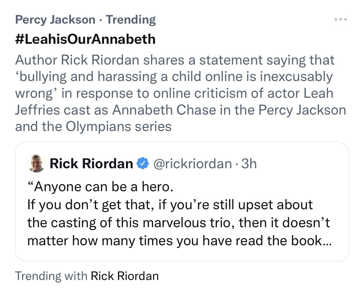 #LeahIsOurAnnabeth Read Rick’s statement at the link below: https://rickriordan.com/2022/05/leah-jeffries-is-annabeth-chase/ … -
