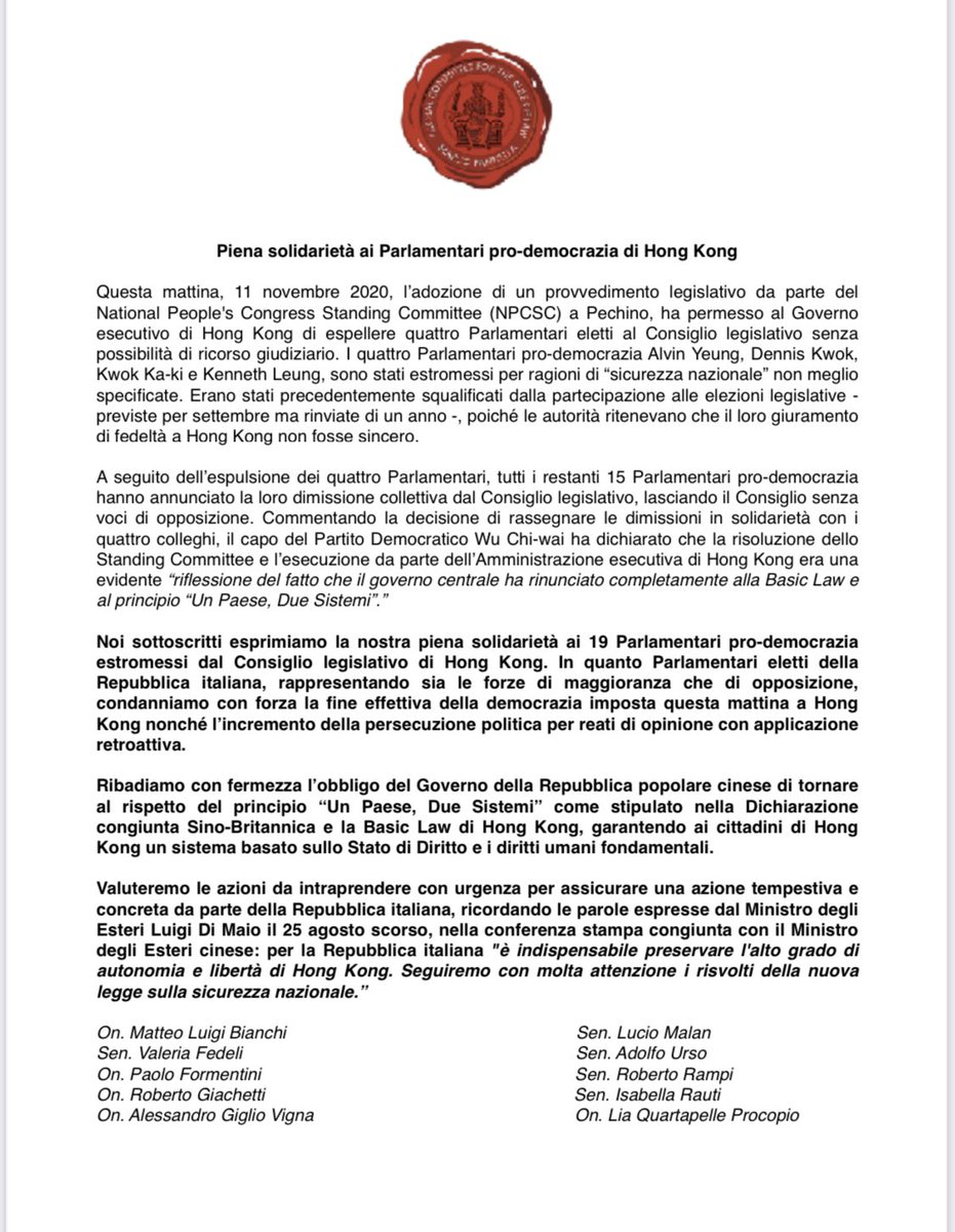 Joint Declaration by cross-party group of Italian MPs & personalities in support of Pan-Democratic legislators
