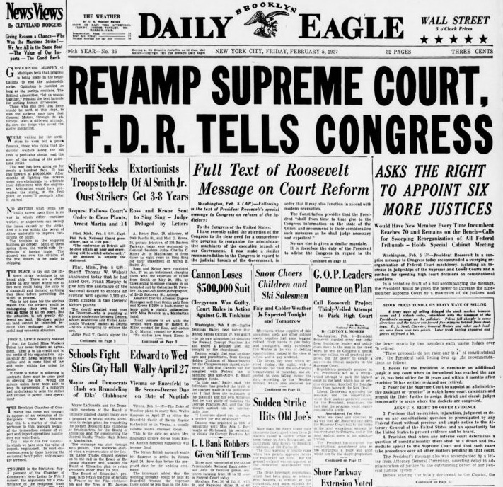 #supremecourt#legislation#courthistory On February 5, 1937, President Franklin Roosevelt announces a controversial plan to expand the Supreme Court to as many as 15 judges, allegedly to make it more efficient... http://ow.ly/u1C150yenkS pic.twitter.com/UHAftcosQe