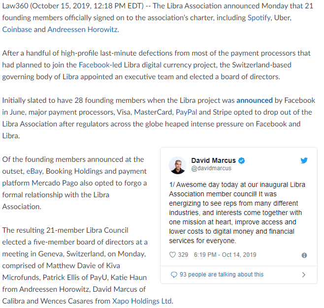 @Libra_@coinbase@Spotify@Uber#LibraAssoc -@facebook 's@davidmarcus said the Monday meeting was "awesome"@Law360 https://www.law360.com/fintech/articles/1209409 …pic.twitter.com/jQHskEzDor