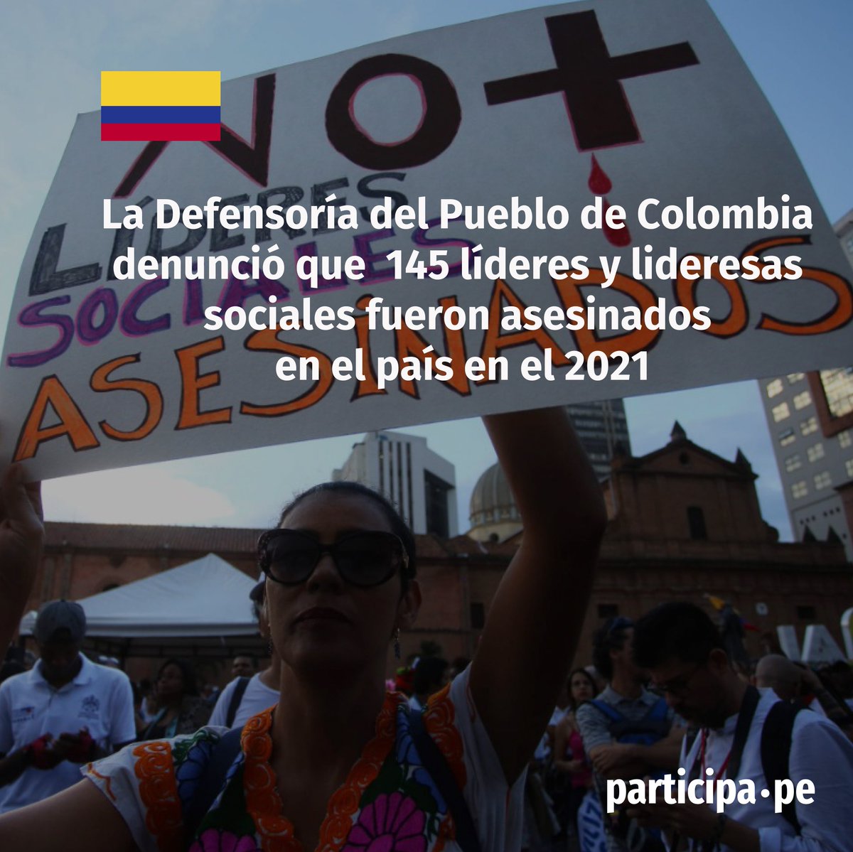 La Defensoría del Pueblo de Colombia denunció que 145 líderes y lideresas sociales fueron asesinados en el país en el 2021.