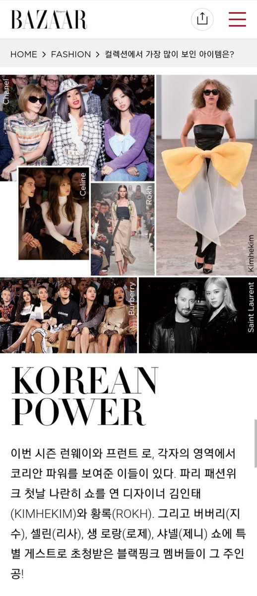 4-2-20 (Bazaar Korea) รายการแสดงคอลเลคชั่นใดที่คุณเห็นมากที่สุด? KOREAN POWER ! เพื่อรันเวย์และแถวหน้าในฤดูกาลแฟชั่นมีผู้ที่แสดงพลังเกาหลีในพื้นที่ของตนมากมาย *Bazaar รวบรวมคนดังเกาหลีที่เข้าร่วมงานแฟนชั่นและเป็นที่พูดถึง อย่างมากซึ่งมี