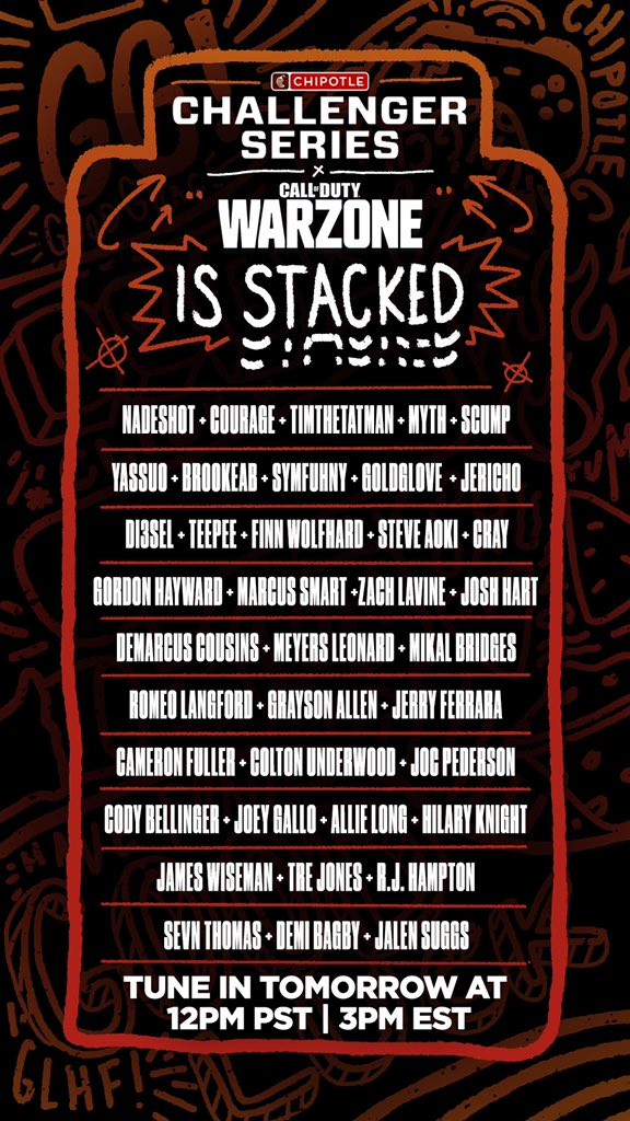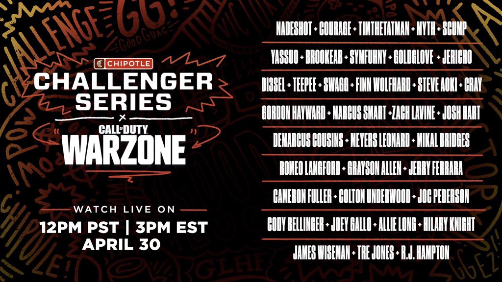 @ChipotleTweets Warzone Challenge with a few friends on Thursday at 2P CST. Tune in at http://chip.tl/chiptwitch#sponsored#LiveFromWarzone pic.twitter.com/XE46ScGdzJ