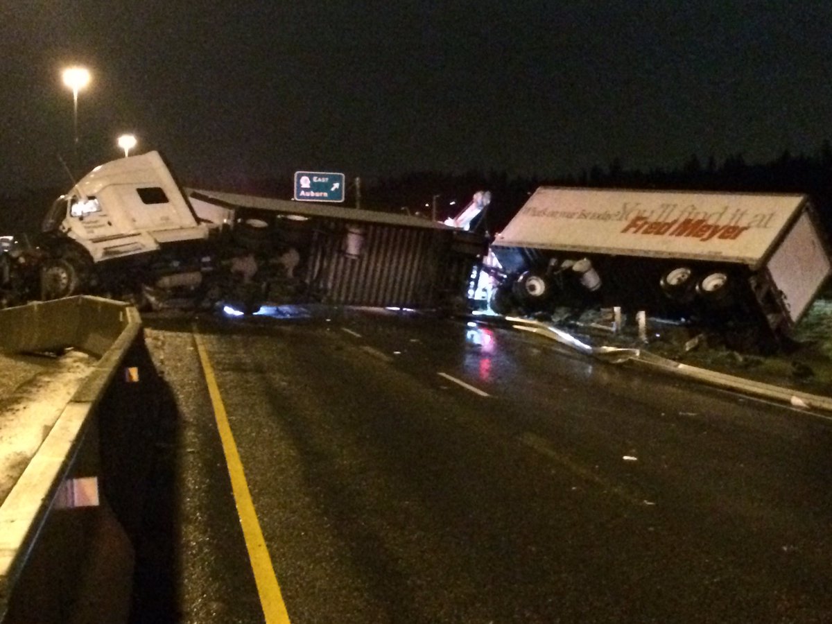 Jack-knifed semi truck on SB Hwy 167. No injuries. All lanes blocked.