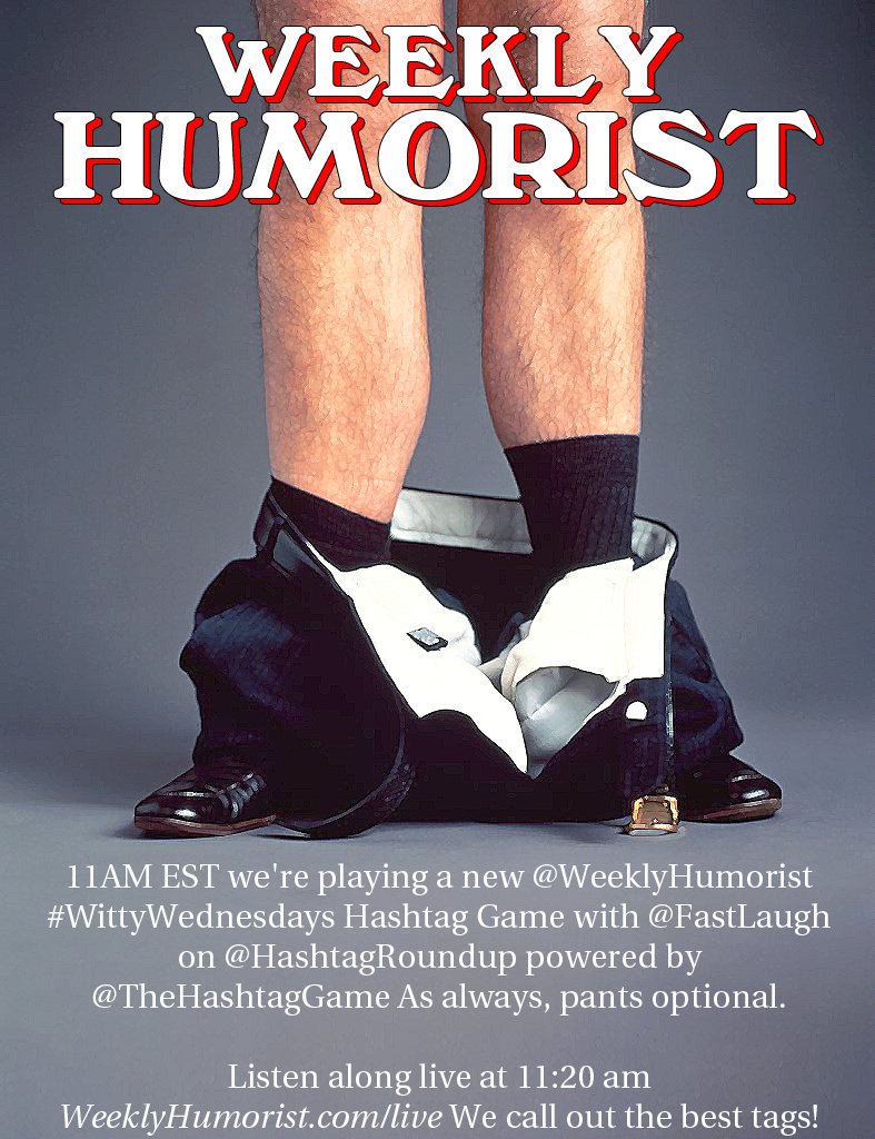 #WeeklyHumorist#WittyWednesday Hashtag game with@FastLaugh on@HashtagRoundup powered by@TheHashtagGame As always, pants optional. Listen along live at 11:20 http://weeklyhumorist.com/live We call out the best tags!#Livestream pic.twitter.com/PltTK8uTGD