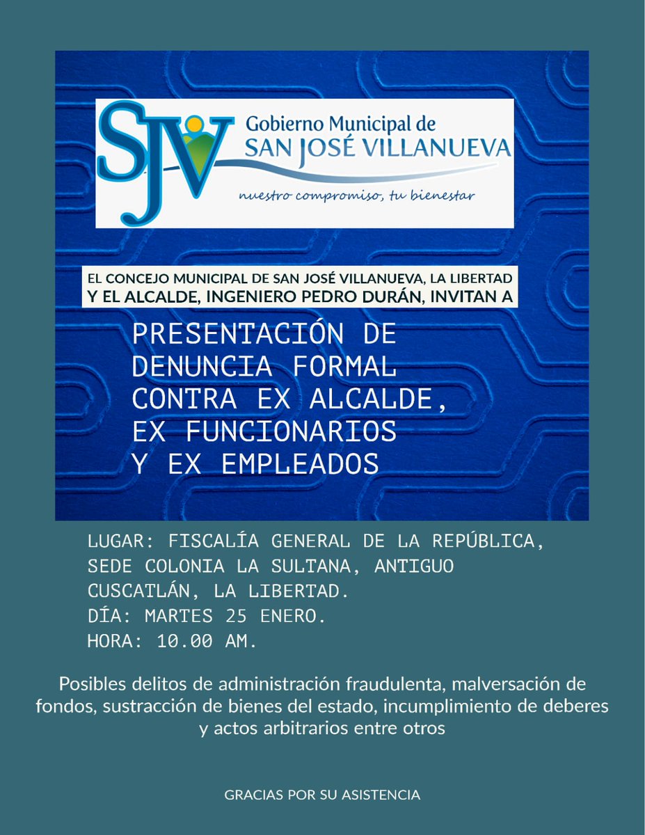 #LoÚltimoLNSV I El Concejo Municipal de San José Villanueva, y el alcalde, Pedro Durán, presentarán mañana ante la@FGR_SV una denuncia formal contra el exalcalde, exfuncionarios y exempleados por varios delitos, entre ellos, malversación de fondos.pic.twitter.com/ayd1ckSJDq