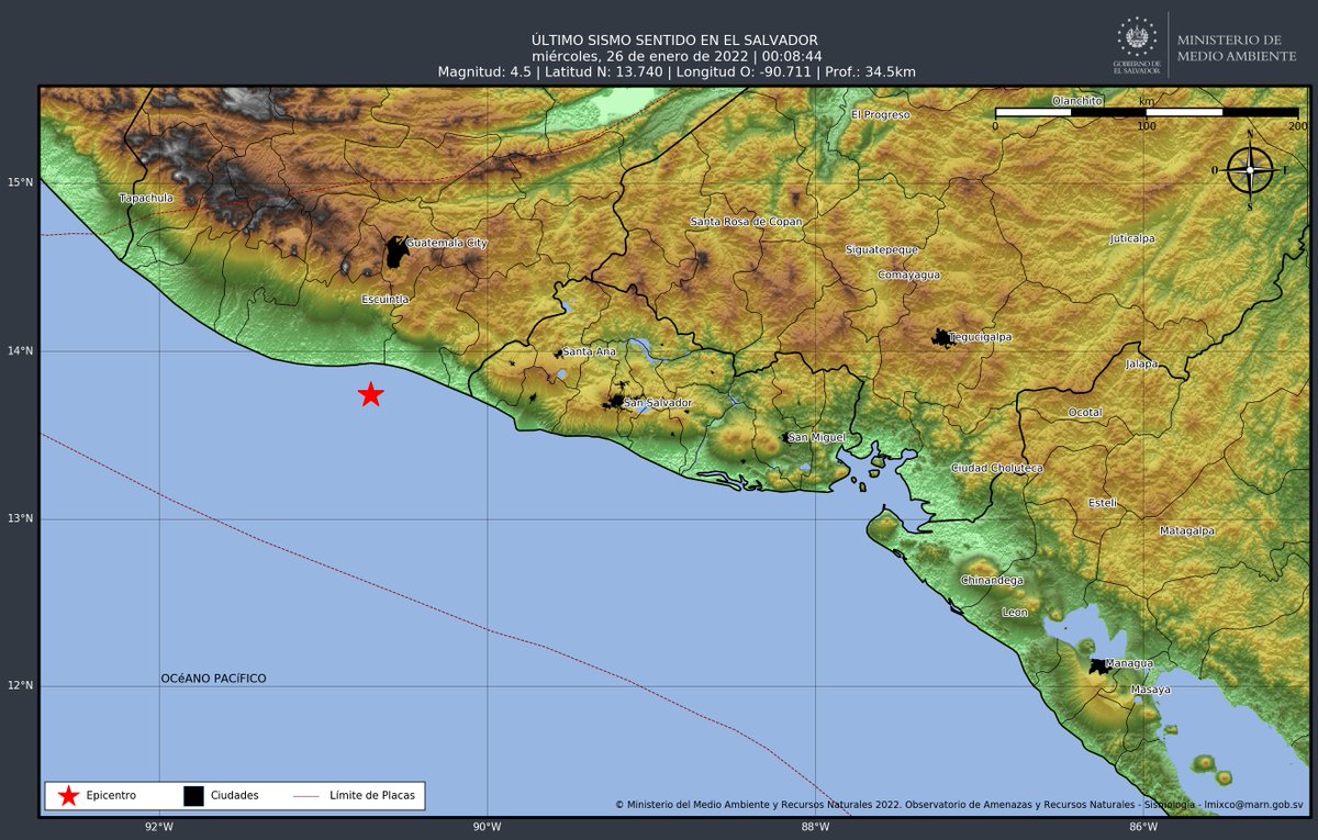 #LoÚltimoLNSV I Sismo magnitud 4.5, frente a la costa de Guatemala. A 77.0 km al oeste de Barra de Santiago. https://twitter.com/MedioAmbienteSV/status/1486223772734603266 …