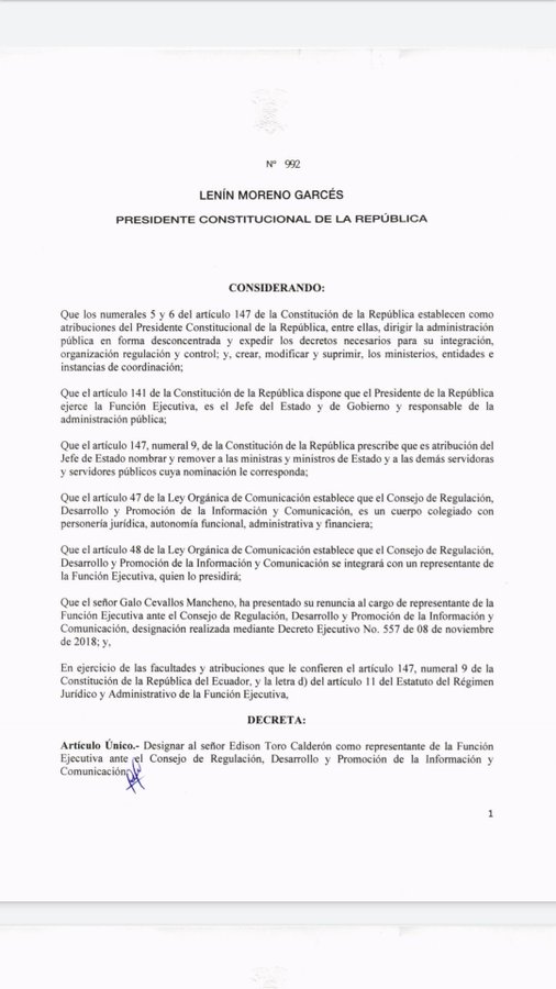 #ATENCIÓN Mediante decreto ejecutivo 992, Presidente Lenin Moreno designa a Edison Toro Calderón como presidente del CORDICOM. El funcionario estuvo a cargo de SUPERCOM e intervino en el cierre de la misma.#LoQueNoVeranEnLaPrensa pic.twitter.com/ATLxiKfw68