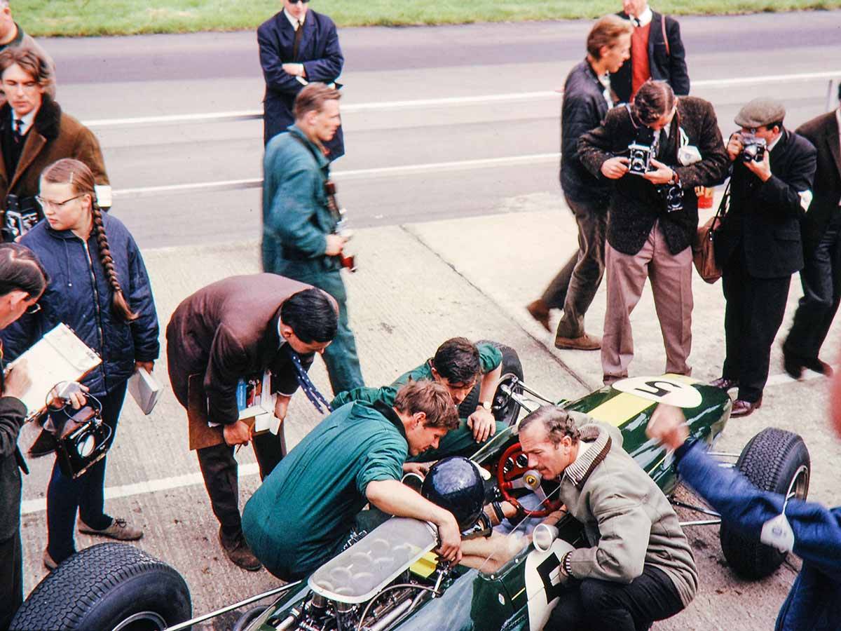 Colin Chapman and the Team Lotus crew talking with Jim Clark before the British Grand Prix in 1965.