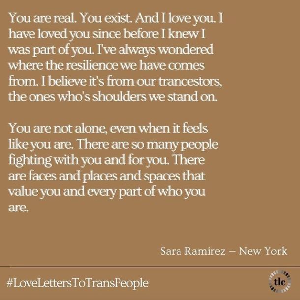 Thank you @SaraRamirez for writing a love letter to our people. We're so grateful to have you as part of our family.#TDOR#TransDayOfRemembrance#LoveLettersToTransPeople#TransAwarenessWeek"pic.twitter.com/w9drL8KDfd