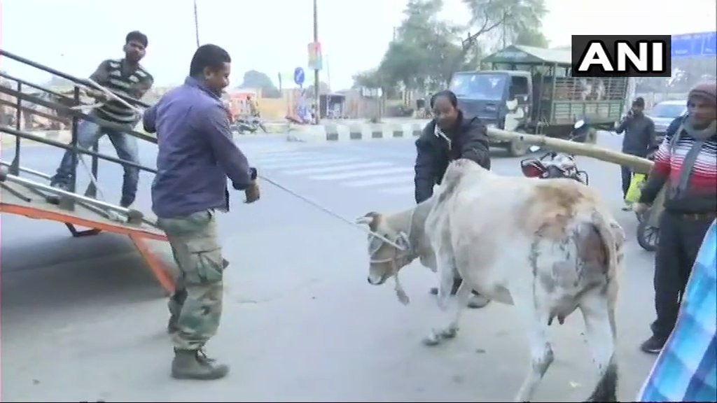 @myogiadityanath has ordered that all stray cattle across the state should be shifted to cow shelters by January 10; Visuals of#Lucknow Municipal Corporation workers rescuing stray cows pic.twitter.com/8TFbaeJWUA