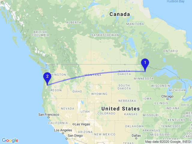 The distance between Squaw Lake, MN, USA and Aumsville, OR 97325, USA is 2218km