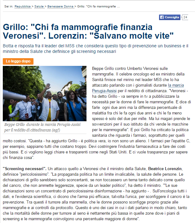 Grillo: "Chi fa mammografie finanzia Veronesi". Dura replica del ministro Lorenzin.