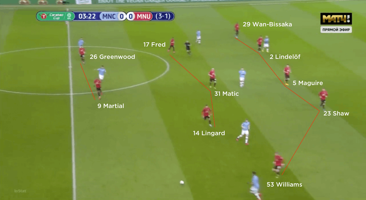 That 3-4-1-2 became a 5-3-2 while they were defending, through Jesse Lingard withdrawing into midfield, and Aaron Wan-Bissaka and Brandon Williams into defence. #MCIMUN#MUFCpic.twitter.com/zAevNC8l3r
