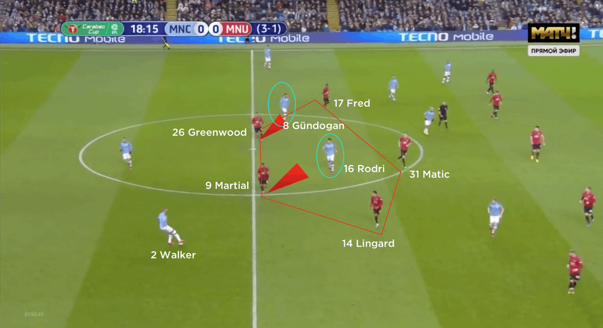 The front two of Anthony Martial and Mason Greenwood were instructed to screen passes towards Rodri and Gündogan, who were operating at the base of City’s midfield. #MCIMUN#MUFCpic.twitter.com/heWocfek8z