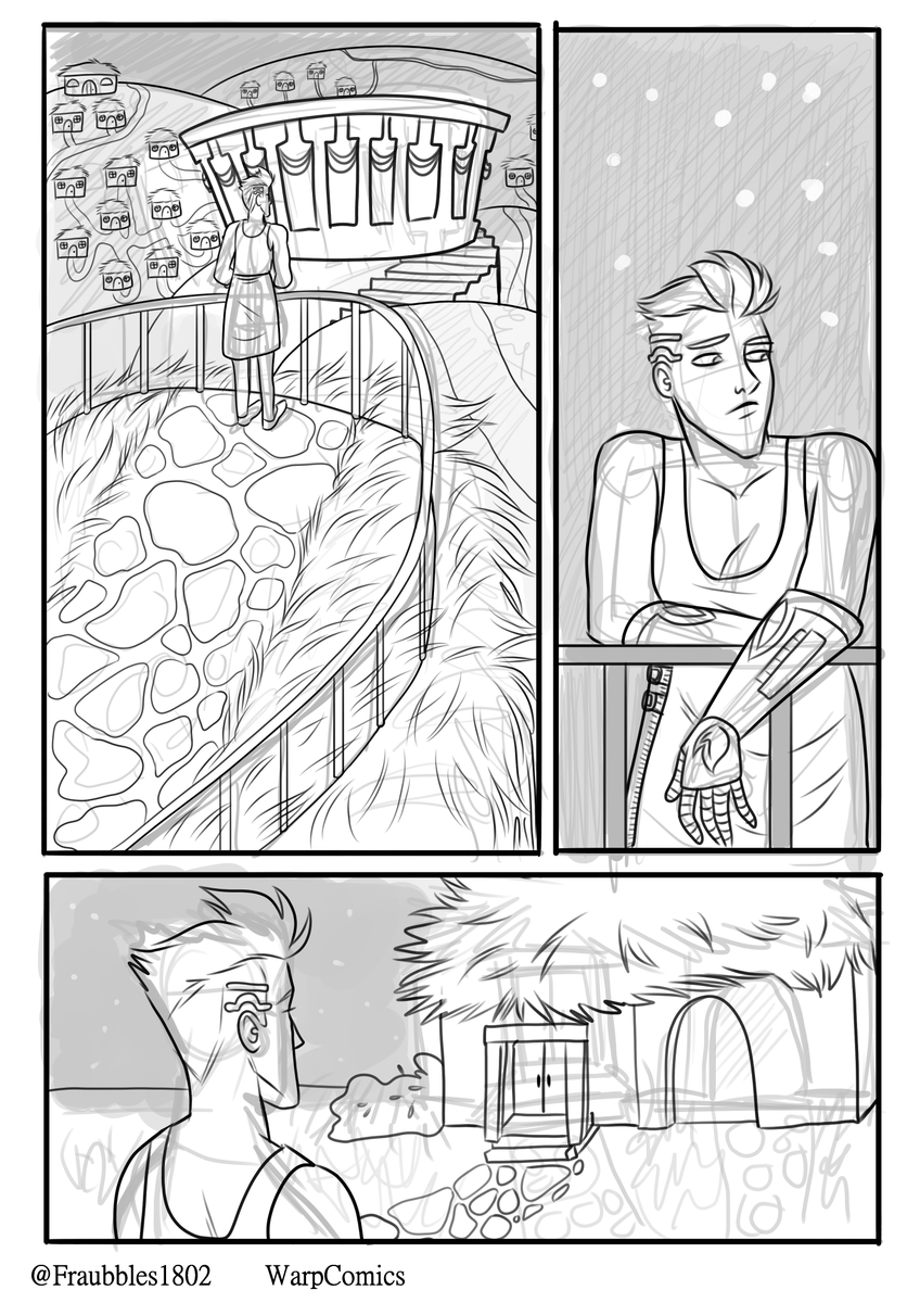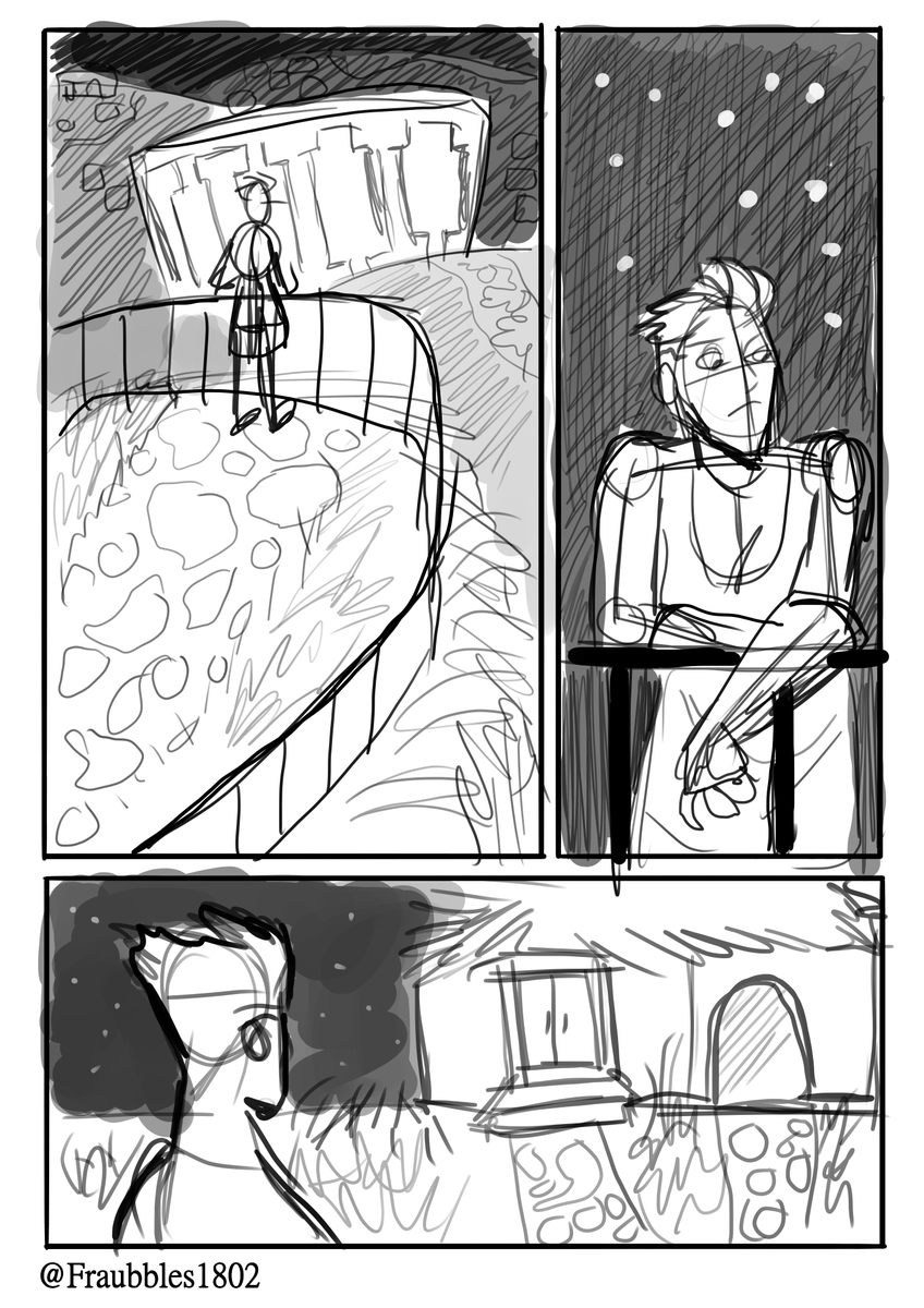 Sketch and line art continuation of this page from Chapter 1: EFFIE. Art by