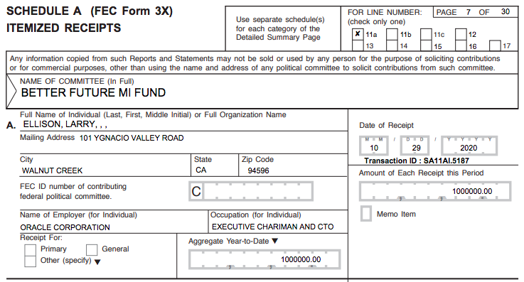 New — Oracle's billionaire founder Larry Ellison put $1 million into a super PAC supporting GOP Senate candidate John James in Michigan in the final days of the campaign. Here's the contribution to Better Future MI Fund.