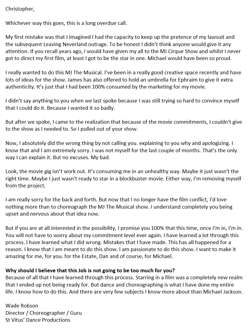 #MJFam Through an anonymous source, I have a copy of Wade Robson's recent letter to Christopher Wheeldon imploring him to give him the job of choreographing the#MJtheMusical show. I can barely contain my excitement, I am literally shaking & twitching. pic.twitter.com/spOtEMBMAQ